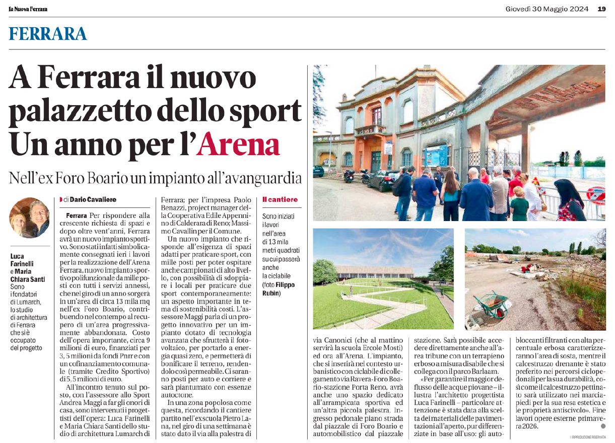 News 1 Gen 2026 Buon 2026 News 18 Nov 2025 Connessioni Urbane: Varata la passerella ciclopedonale News 30 Apr 2025 Rinnovo ISO9001 News 30 Mag 2024 Consegna dei lavori del nuovo impianto sportivo polivalente News 21Feb 2024 Presto i lavori in Foro Boario News 25 Gen 2024 Iniziano i lavori a Casumaro News 13 Apr 2023 Vincitori del concorso di progettazione: nuova scuola primaria / secondaria di primo grado a Cento – Casumaro News 04 Giu 2022 Iniziano i lavori della nuova sede LUMARCH News 11 Feb 2022 Restyling del liceo scientifico roiti, ricostruzione palazzina uffici, riqualificazione energetica e miglioramento sismico – ferrara News 25 Set 2021 Inaugurata la sede COPMA - Ferrara News 21 Set 2021 Lotto Funzionale A - Ambito Ex Mof - Intervento A6 parcheggio ex Pisa - Ferrara News 29 Mar 2021 La nuova passerella ciclopedonale sul Reno